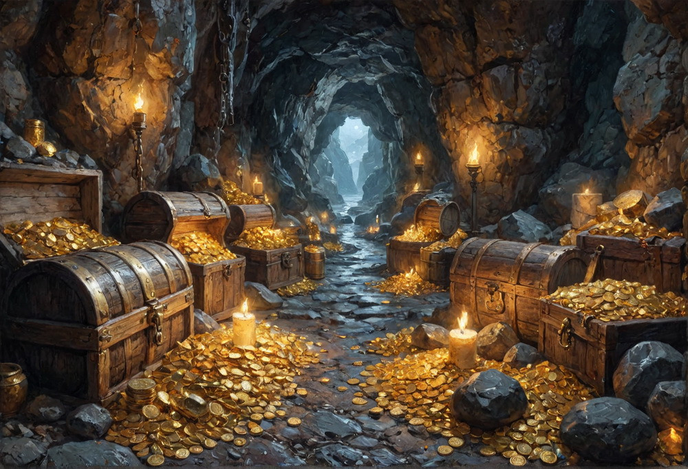 На изображении представлен пещерный интерьер, заполненный сокровищами. Каменные стены и своды пещеры..