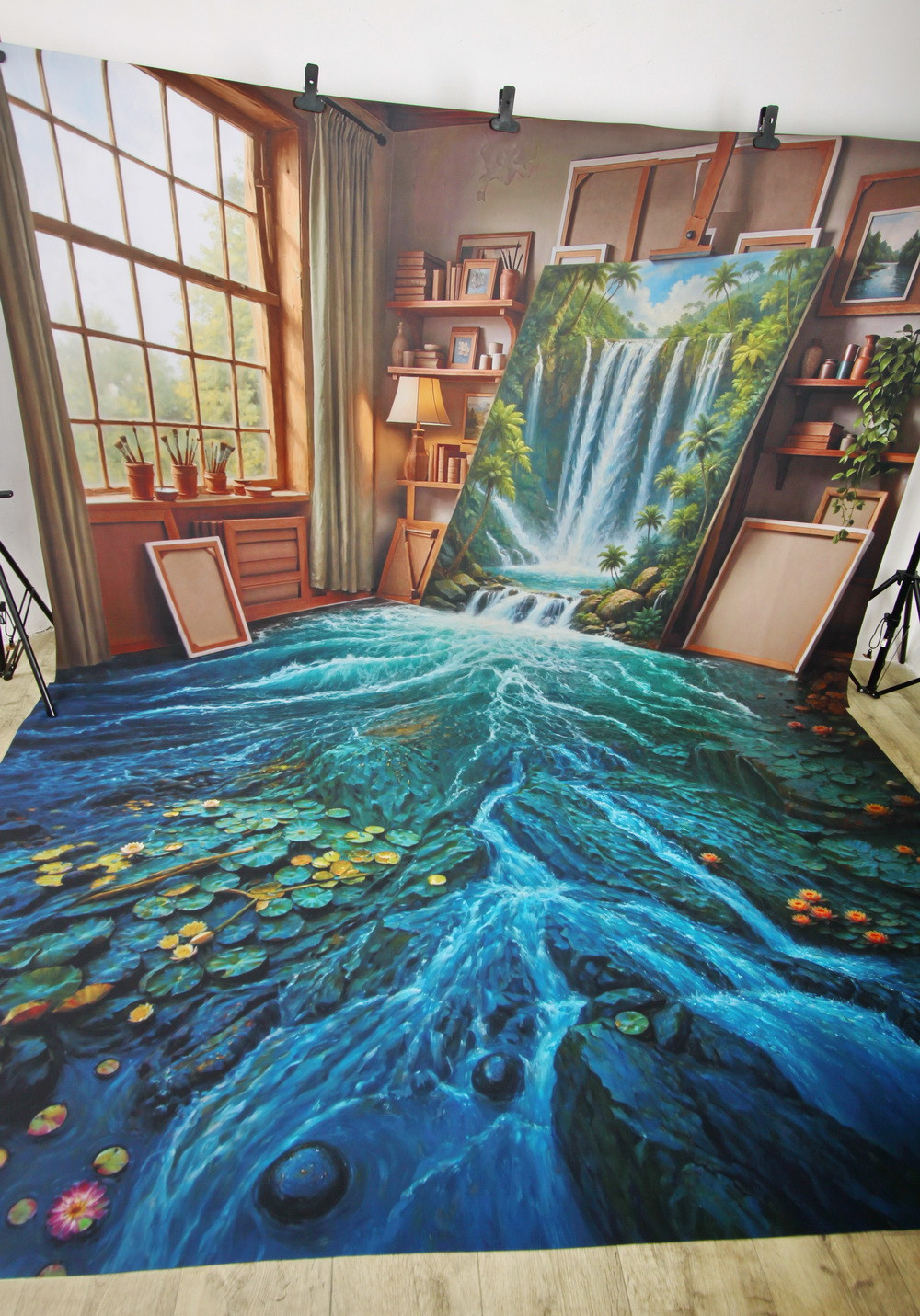 В комнате, оформленной в теплых тонах, пол трансформируется в бурный поток воды, украшенный кувшинка..