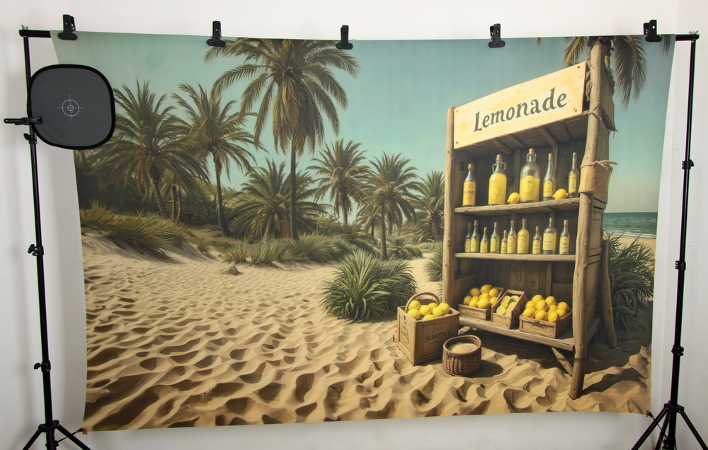 Изображение представляет собой пейзаж песчаного морского пляжа с пальмами и киоском, продающим лимон..