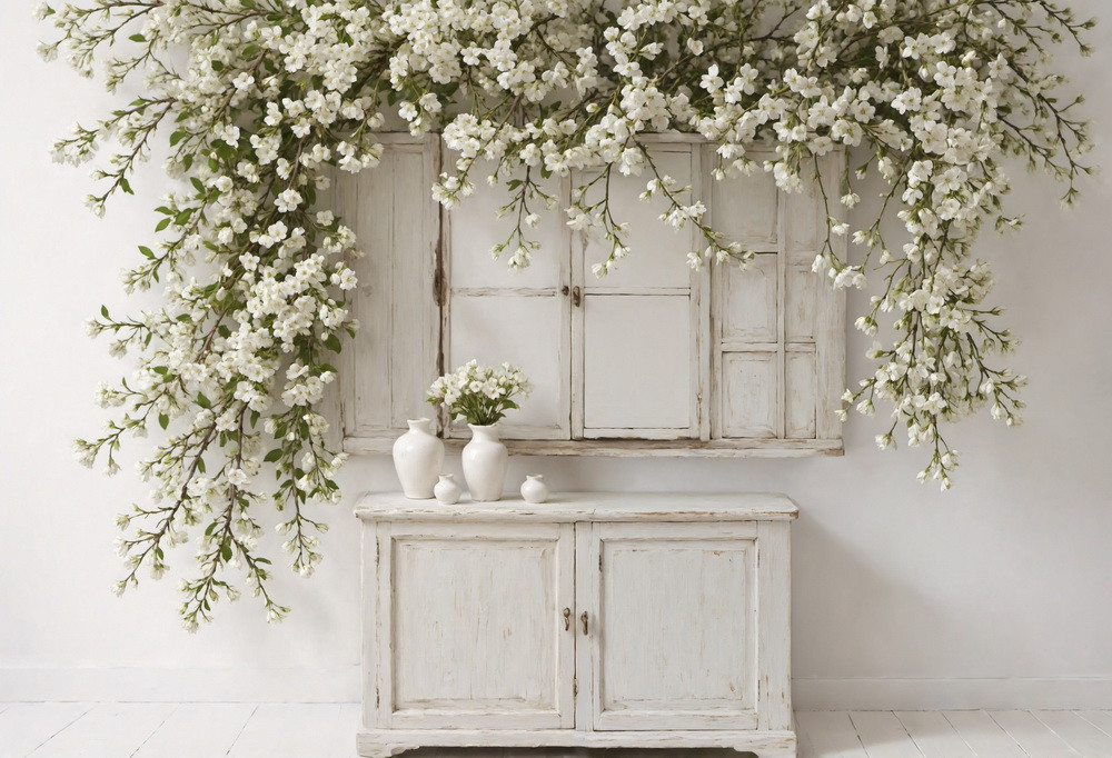 На изображении представлен интерьер с элементами в стиле шебби-шик. В центре композиции стоит старинный белый буфет с двумя дверцами. Над буфетом висит полка, стилизованная под окно с закрытыми ставнями, также выкрашенная в белый цвет. На буфете размещены две белые керамические вазы с букетами белых цветов и три маленькие декоративные вазочки.