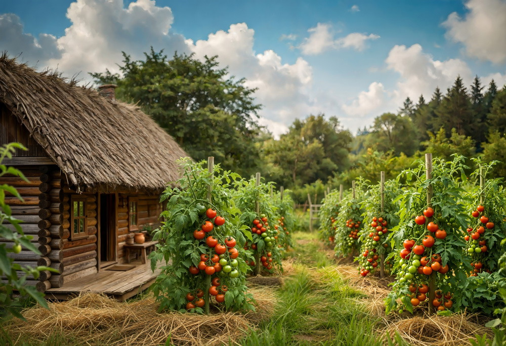 Справа и слева от рядов с помидорами расположены дерновые тропинки, покрытые сухой травой и соломой, которая служит для защиты корней растений. Вдоль одного из рядов есть небольшая деревянная скамейка и глиняная кувшинка, поставленная на передний план у входа в уютный дом-бревенчатую хижину.