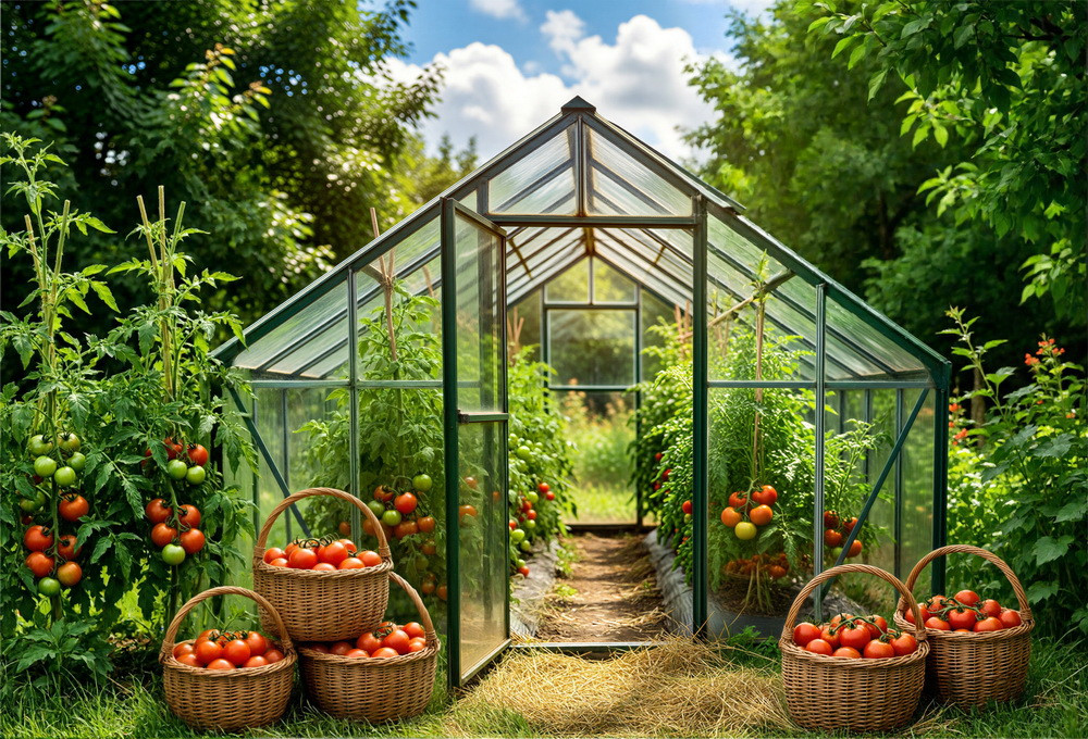 На изображении изображена уютная деревенская сцена с грядками помидоров, расположенными в рядах. Помидоры растут на высоких кустах, закрепленных на деревянных вертикальных опорах. На кустах видно созревшие красные помидоры, а также зеленые, неспелые плоды. Листья у растений крупные, насыщенного зеленого цвета, создают густую крону вокруг плодов.