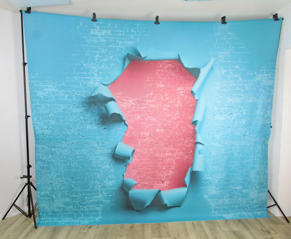 Оба слоя стены имеют структуру, имитирующую кирпичную кладку. Края голубого слоя, окружающие отверстие, порваны и загнуты, демонстрируя текстуру внутренней поверхности материала, также окрашенную в голубой цвет. Форма отверстия неправильная, с загнутыми краями, что создает эффект сломанного или разорванного материала.