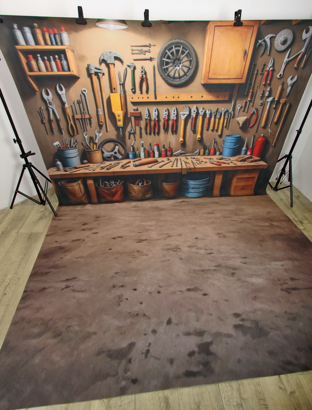 Изображена мастерская. Стены и потолок обшиты деревянными панелями. Под потолком висит светильник. На левой стене находится небольшая деревянная полка с бутылками и банками. Под полкой висят плоскогубцы, кусачки, отвертки и другие инструменты. В центре стены висит молоток, рядом с ним - дрель и еще один молоток побольше. Справа от молотков находится горизонтальная деревянная планка, на которой висят различные плоскогубцы и ключи. Над планкой висит деревянный шкафчик. С правой стороны стены висят различные инструменты, такие как гаечные ключи, молотки и отвертки.