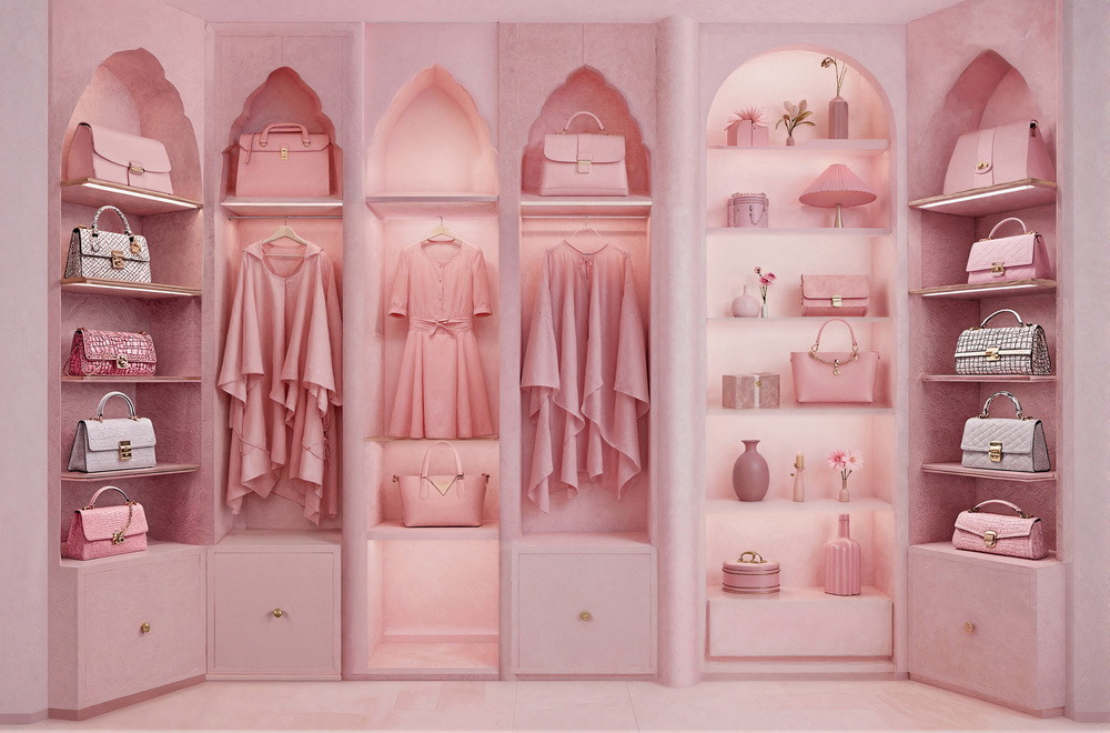 В левой и правой секциях находятся полки, на которых аккуратно расставлены различные женские сумочки розовых оттенков. Некоторые полки подсвечены. В нижней части каждой секции расположен выдвижной ящик с золотистой круглой ручкой.