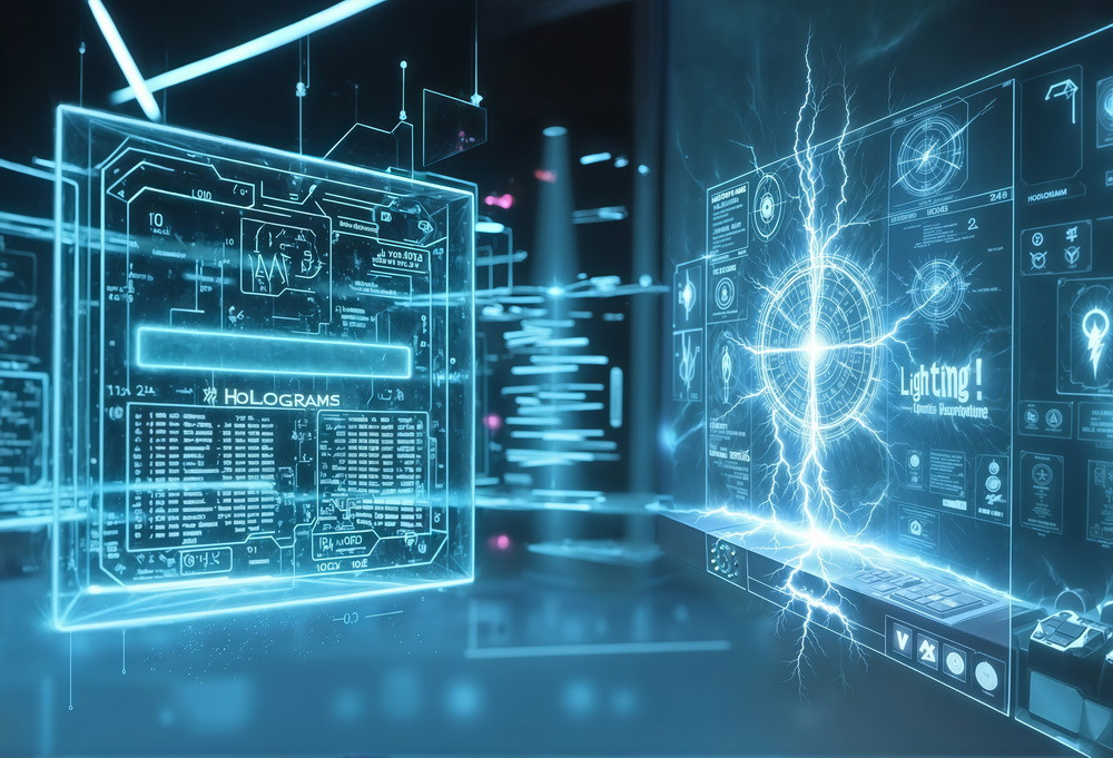 Изображение демонстрирует два голографических интерфейса в научно-фантастическом окружении. Слева расположен кубический голографический дисплей. На его гранях отображается различная информация: графики, текст, коды и схематические рисунки. В нижней части одной из граней видна надпись "HOLOGRAMS". Также различимы фрагменты текста с цифрами и буквами, вроде "10 L010", "11 24", "10GY 10".Справа находится плоский голографический экран, встроенный в некое устройство, отдаленно напоминающее ноутбук. На экране отображены графики, диаграммы и иконки. В центре экрана расположен большой круг с делениями, окруженный электрическими разрядами. Над кругом крупно написано "Lighting!", а под ним - "Equantis Pscurtontime". Вверху экрана виден текст "248 HODLOMMM" и цифра "2". Также есть набор различных иконок и символов. Фон изображения размыт и содержит элементы архитектуры, подсвеченные неоновым светом. Создается впечатление, что интерфейсы находятся в какой-то высокотехнологичной лаборатории или командном центре.