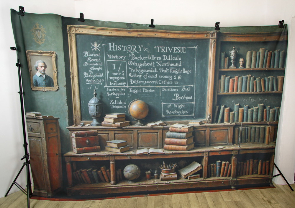 В центре композиции доминирует большая черная доска в деревянной раме, на которой белым мелом написаны слова и фразы. Текст на доске включает в себя "HISTORY te 'TRIVESUE", а также списки слов и фраз. Под доской находится деревянный стол, на котором расставлены стопки книг, глобус, чернильница и другие предметы.