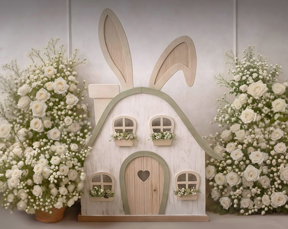 Слева и справа от домика располагаются крупные букеты из белых роз и мелких белых цветочков, создающие пышное обрамление. Фон светлый, однотонный.