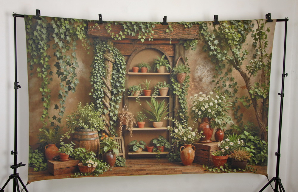 В центре композиции находится деревянная конструкция, напоминающая портал или дверной проем. Она состоит из двух вертикальных столбов и горизонтальной перекладины, сделанных из грубо обработанного дерева. Внутри этой конструкции расположена арочная ниша, в которой размещены полки. На полках стоят различные растения в горшках, как маленькие, так и среднего размера. Слева от конструкции свисает густая лиана плюща, полностью покрывающая один из столбов.
