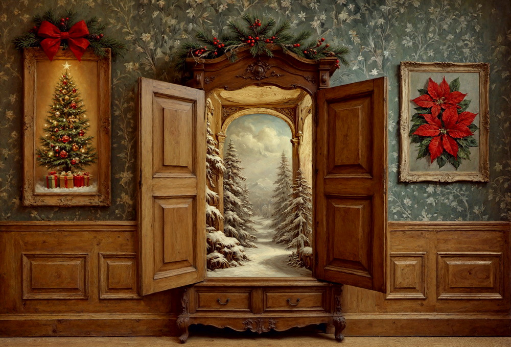 Композиция организована вокруг большого старинного шкафа, чьи открытые дверцы обрамляют живописную сцену заснеженного леса. С каждой стороны шкафа висят картины в рамках, одна из которых украшена рождественской елкой, а другая — цветком пуансеттии. Сцена сбалансирована, с центральной точкой входа в зимний пейзаж, привлекающей взгляд зрителя, а украшения обрамляют ее, создавая ощущение уюта и праздника. Свет, вероятно, от внутреннего освещения шкафа и картин, создает контраст и акцентирует внимание на элементах.