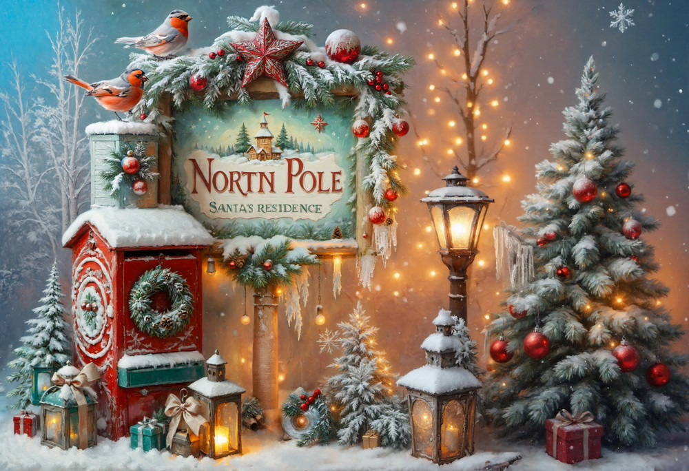 На изображении представлен зимний пейзаж с новогодним настроением. В центре композиции находится указатель с надписью "North Pole Santa's Residence" (Северный Полюс Резиденция Санты). Указатель украшен еловыми ветвями, красными шарами и большой красной звездой. На вершине указателя сидят две красногрудые птицы. Слева от указателя стоит красный почтовый ящик, также украшенный еловым венком. Рядом с почтовым ящиком находятся маленькие елочки, фонарики со свечами и небольшие подарочные коробки. Справа от указателя возвышается фонарный столб, излучающий теплый свет, и новогодняя елка, украшенная красными шарами. Фон состоит из заснеженных деревьев, на которых развешаны гирлянды, создающие атмосферу сказки и волшебства. На всем изображении идет снег.