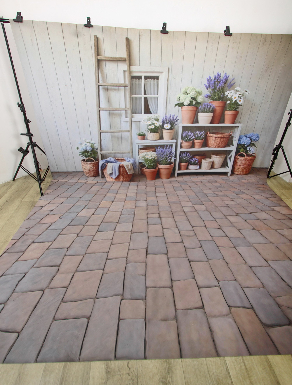 На фотографии изображен уличный уголок с деревенским декором. Задний план состоит из белой деревянной стены с узкой деревянной лестницей, прислоненной к стене слева от маленького окна с белой рамой и белой занавеской.