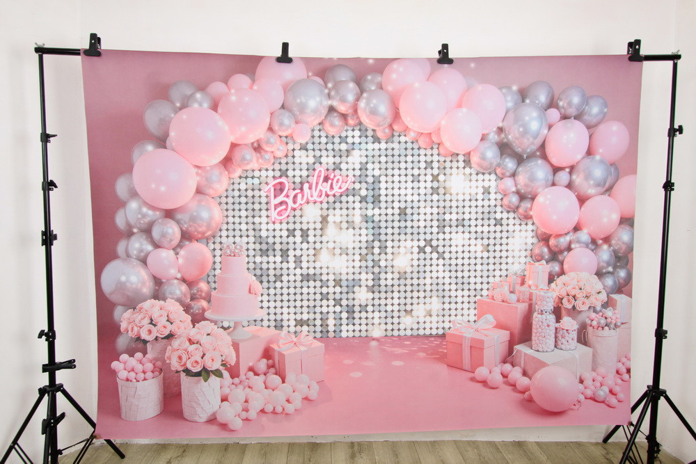 Перед фоном располагается арка из розовых и серебряных воздушных шаров разных размеров. По обе стороны от арки расположены розовые цветы в корзинах и вазах. Также видны розовые подарочные коробки, перевязанные белыми лентами, и ваза с розовыми конфетами.