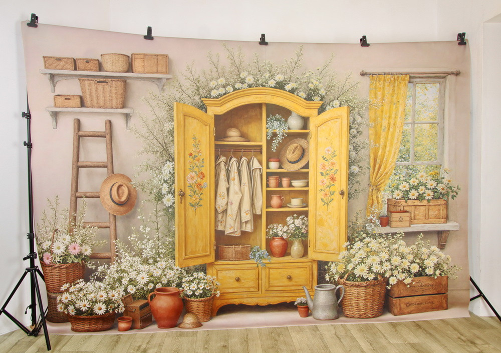 Справа от шкафа находится окно с желтой занавеской. На подоконнике и рядом с ним стоят деревянные ящики и горшки с ромашками. На полу перед шкафом также стоят корзины и горшки с цветами, а также керамические кувшины и металлическая лейка.