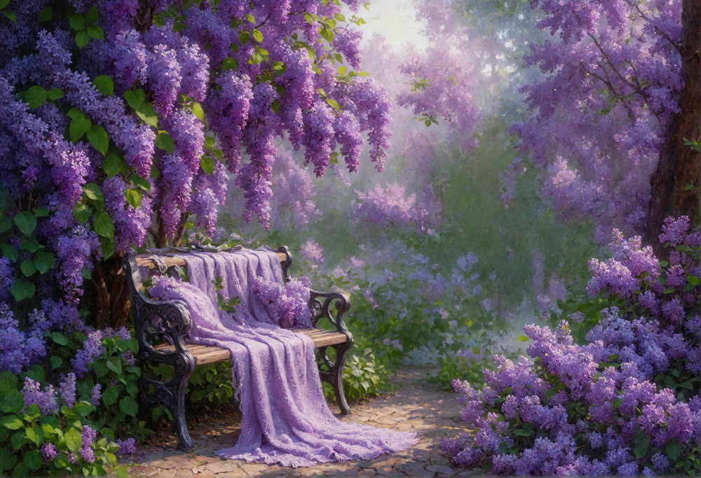 Изображение показывает пейзаж, наполненный цветущей сиренью. В центре композиции находится скамейка, частично задрапированная фиолетовым вязаным пледом, который свисает до земли. Скамейка установлена у основания дерева, с которого свисают гроздья сирени.