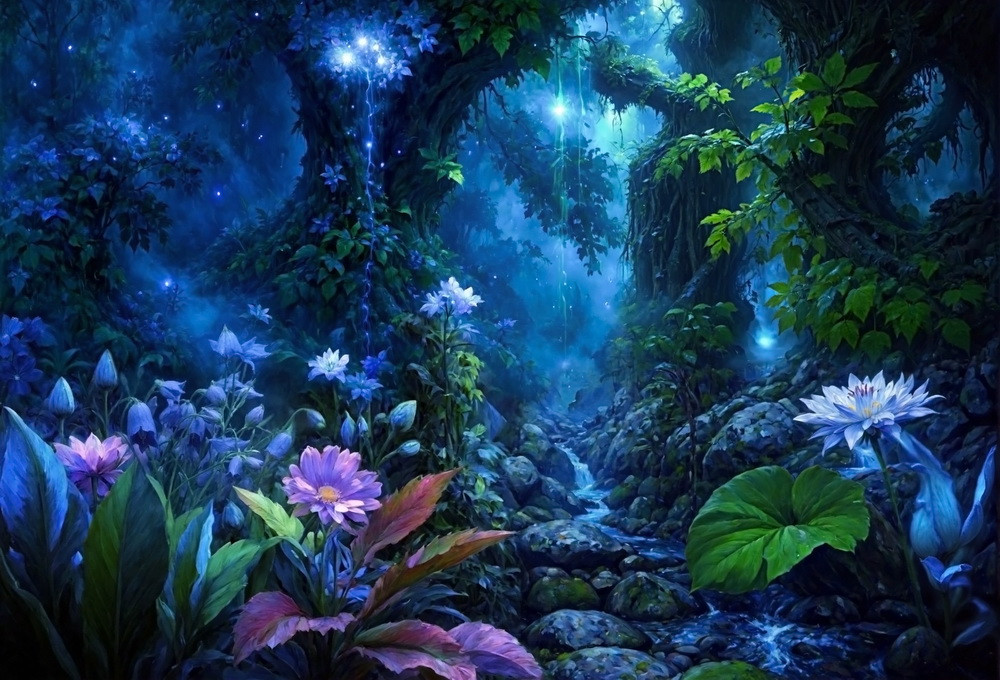 Изображение представляет собой живописную картину, изображающую внеземной лес. Основная цветовая палитра – сине-зеленая с добавлением фиолетовых и розовых оттенков. В передней части изображения находятся крупные цветы различных оттенков, преимущественно фиолетовые и белые, окруженные большими зелеными листьями. Далее в глубину уходит небольшой ручей, протекающий между камнями, покрытыми мхом. По берегам ручья растут различные растения. Вдали виднеются деревья с густой листвой, создающие атмосферу таинственности. С деревьев свисают светящиеся нити, добавляющие волшебства. В верхней части изображения есть небольшие яркие пятна света, которые, подобно звездам, пробиваются сквозь листву. Общее впечатление – это сказочный, немного мистический лес, полный магии и тайны.