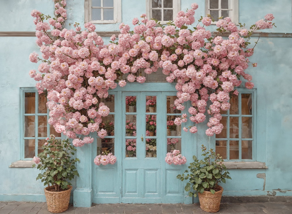 На изображении представлен фасад здания, окрашенный в голубой цвет. На фасаде расположены окна и дверь, также окрашенные в голубой цвет. Дверь стеклянная, состоит из нескольких секций. За дверью просматривается интерьер, наполненный цветами, схожими с теми, что украшают фасад. Фасад обильно украшен розовыми цветами, которые частично закрывают окна и нависают над дверью, образуя арку. По обе стороны от двери, на уровне земли, стоят плетеные горшки с зелеными растениями. Пол выложен из камня.