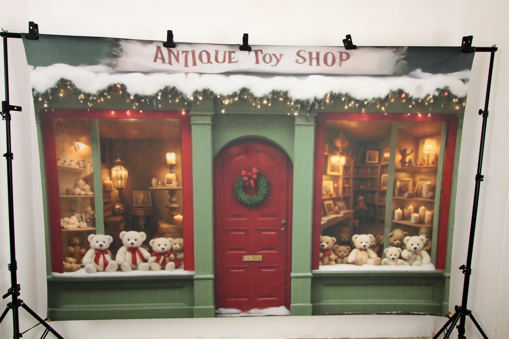 В каждой из витрин располагаются плюшевые медведи разных размеров. Некоторые из них сидят на снежном покрытии у стекла, а другие находятся в глубине магазина. Медведи, сидящие ближе к стеклу, украшены лентами. В глубине магазина заметно множество других мягких игрушек.