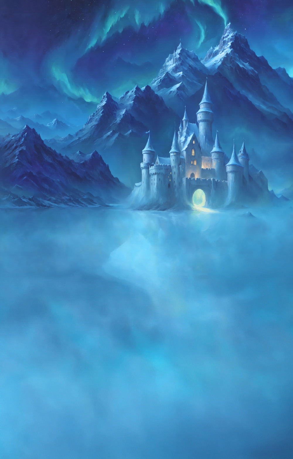 Замок, расположенный в центре, выполнен в бело-серых тонах и имеет несколько башен с коническими крышами. В некоторых окнах замка виден теплый желтый свет. Под замком простирается туманно-голубая дымка, скрывающая его основание.